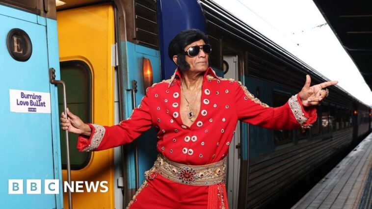 Elvis impersonator Alfred Vaz poses prior to boarding a train, departing for the Parkes Elvis Festival, at Sydney’s Central Station in Australia.