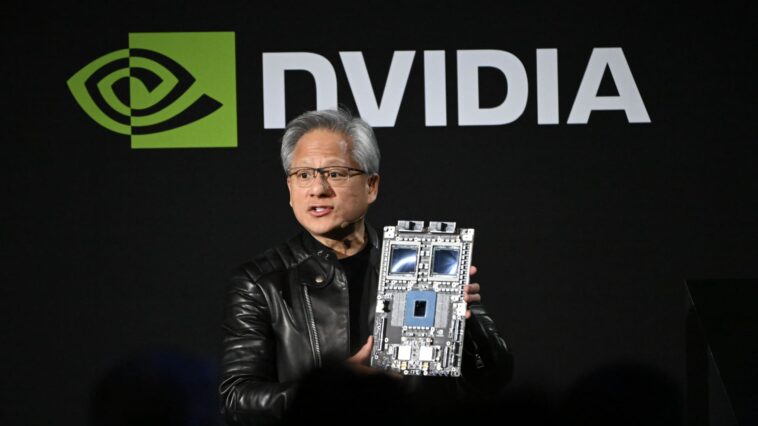 Jensen Huang, co-founder and CEO of Nvidia Corp., holds up the company’s AI accelerator chips for data centers as he speaks during the Nvidia AI Summit Japan in Tokyo on Nov. 13, 2024.