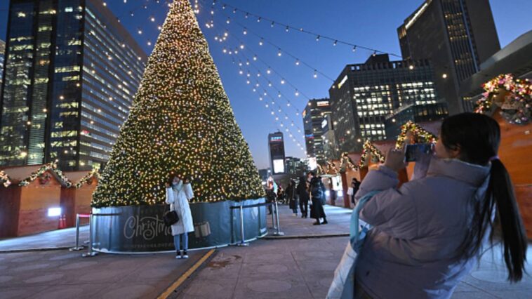 People posing for photos in front of a Christmas light installation in central Seoul on December 22, 2023.