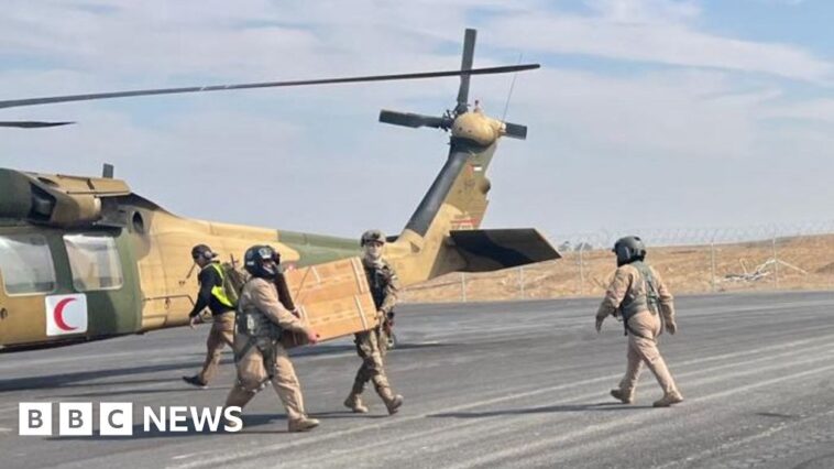 The BBC was allowed to join the mission, which landed in Israeli-held territory in southern Gaza between the Israeli border and the town of Wadi al-Salqa.