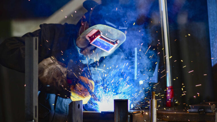 A worker welds at an agricultural machinery manufacturing enterprise in Qingzhou Economic Development Zone in Qingzhou, China, on August 31, 2024.