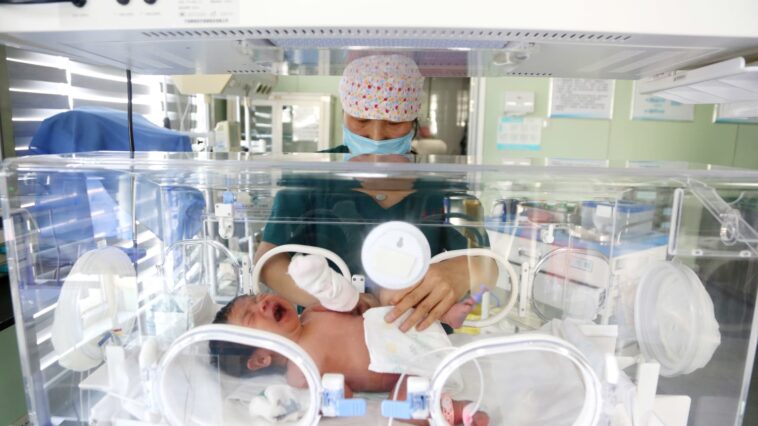A medical worker is taking care of newborns at Dongfang Hospital in Lianyungang, China, on January 1, 2024.
