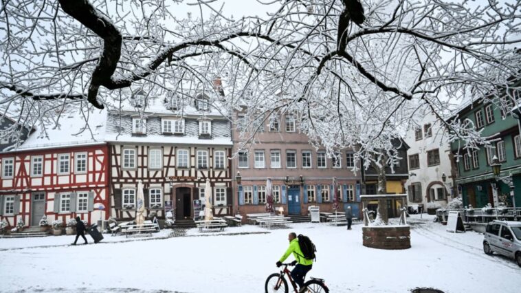 A man rides bicycle on a snow-covered street after snowfall in Frankfurt am Main, western Germany, on December 29, 2024.