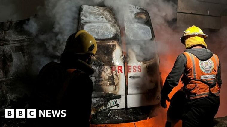 The channel posted a video of what it said was the burning vehicle with “press” signage on the back doors.