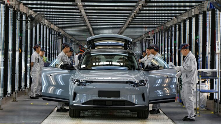 Employees work on the assembly line of new energy vehicles at a factory of Chinese EV startup Leapmotor on April 1, 2024 in Jinhua, Zhejiang Province of China.