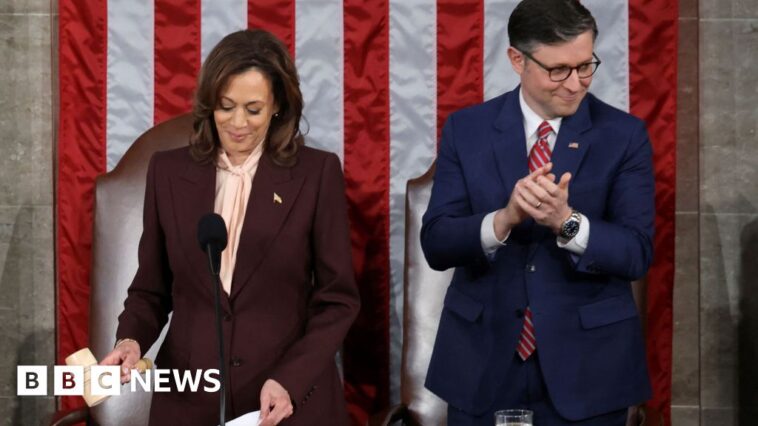 Vice-President Kamala Harris, who Trump defeated in the 2024 election, presided over the event as required by the US Constitution.