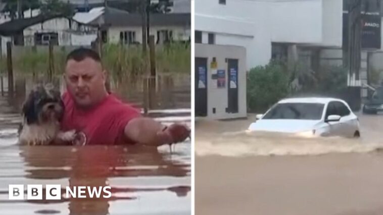 Footage shows partially submerged cars navigating flooded streets and Itapema Mayor Alexandre Xepa calling for aid and rescue assistance.