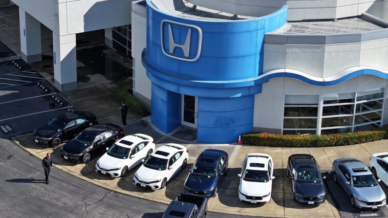 In an aerial view, brand new Honda cars are displayed on the sales lot at Honda Marin on February 06, 2024 in San Rafael, California. Honda announced the recall of 750,000 vehicles in the U.S. for an air bag defect that could unintentionally deploy the air bags in a collision.