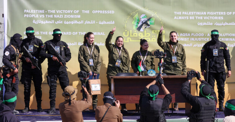 In May, the Israel military released a three-minute edited collection of videos, verified by The New York Times, showing Palestinian fighters, some wearing Hamas headbands, binding the hands of five women, including the four being released on Saturday. The footage was recorded by body cameras worn by the Hamas militants who abducted them, according to the Hostages and Missing Families Forum, which represents relatives of many of the captives.