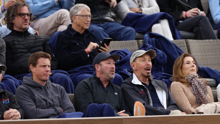 Larry Ellison and Monica Seles and Bill Gates (back row) watch Carlos Alcaraz of Spain play against Alexander Zverev of Germany in their Quarterfinal match during the BNP Paribas Open in Indian Wells, California, on March 14, 2024.