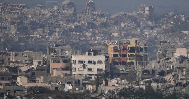 Destroyed buildings by Israeli bombardments as seen inside the Gaza Strip from southern Israel, Thursday, Jan. 16, 2025.
