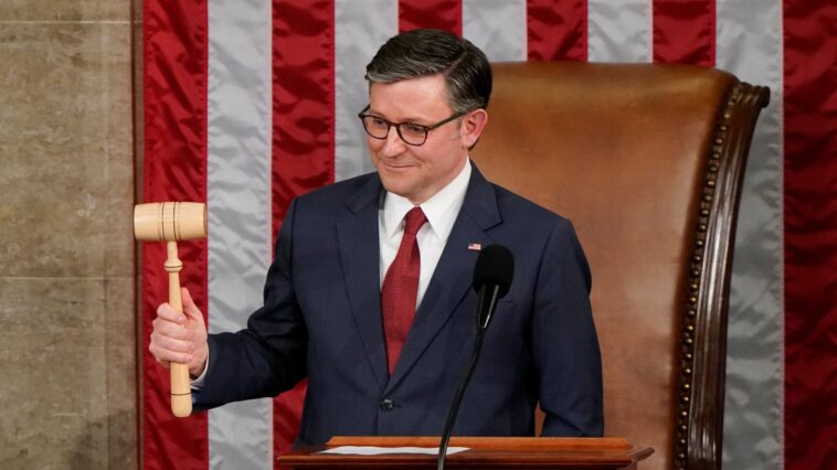 House Speaker Mike Johnson (R-LA) poses with the gavel after being sworn in, on the first day of the 119th Congress at the U.S. Capitol in Washington, U.S., January 3, 2025.