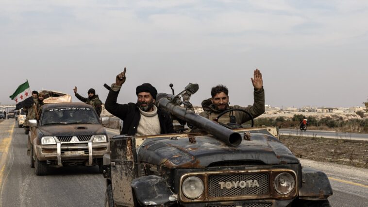 National Syrian Army soldiers celebrate after opposition forces led by Hayat Tahrir al-Sham took control of the Hama city center and surrounding villages on Dec. 6, 2024, in Hama, Syria.