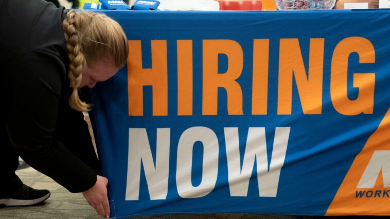 A worker adjusts hiring signage at a job and resource fair hosted by the Mountain Area Workforce Development Board in partnership with NCWorks in Hendersonville, North Carolina, US, on Tuesday, Nov. 19, 2024.