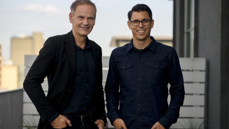 A provided image of Oliver Blume, CEO of Volkswagen Group and RJ Scaringe, founder and CEO of Rivian, as the companies announce joint venture plans on June 25, 2024.