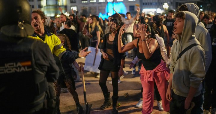 A group of protestors clashed with riot police in front of Valencia’s city hall, where the protestors started their march to the seat of the regional government. Police used batons to beat them back.