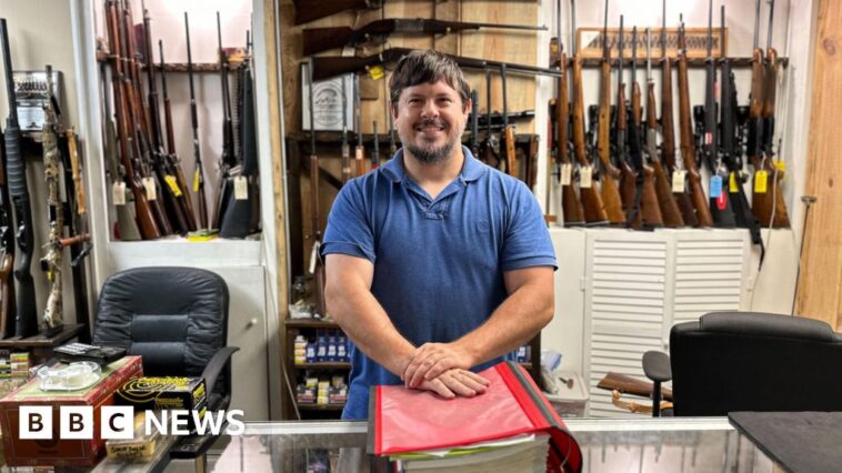 BBC James Rabun in his family's gun store, surrounded by different kinds of gunsBBC