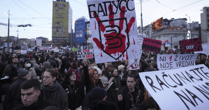 The rally at Belgrade’s Slavija Square, one of the largest in recent years, was called by students and farmer unions. It was part of a wider movement demanding accountability over the Nov. 1 collapse of a canopy at a railway station in the country’s north that killed 15 people.