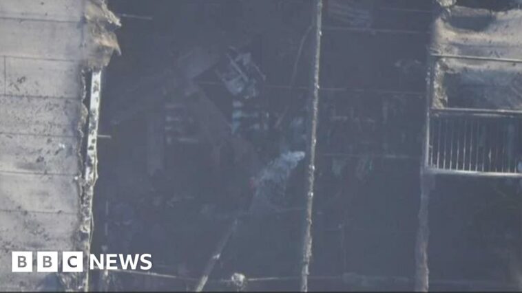 Aerial photos of the scene show parts of the plane inside the building. The crash also sparked a fire which was extinguished by fire crews.