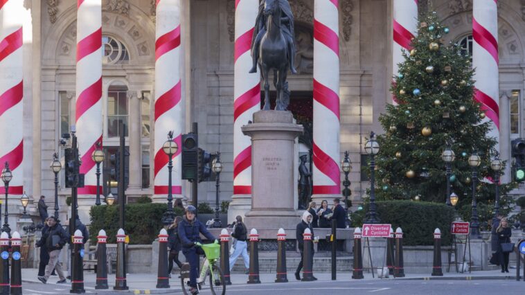 The columns of Royal Exchange are dressed for Christmas, at Bank in the City of London, the capital’s financial district, on 20th November 2024, in London, England.