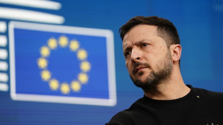 Volodymyr Zelenskyy President of Ukraine speaks at the press conference during the European Council Meeting on December 19, 2024 in Brussels, Belgium.