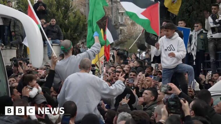 The BBC’s Jon Donnison watched on in Ramallah as Palestinian prisoners released by Israel were greeted by cheering crowds in the West Bank.